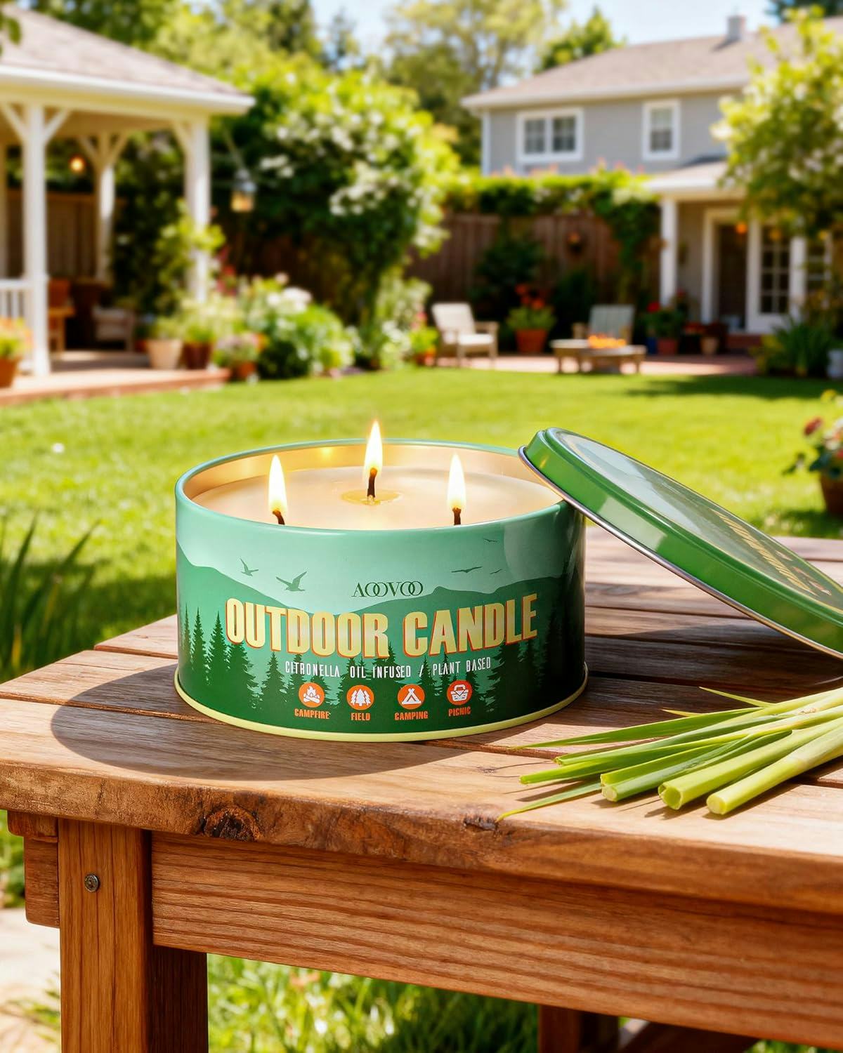This big citronella candle arrives in a tin so you can set it on an outdoor table, ready to light when your people gather there. The lid keeps the rain out of your candle, and the three wicks turn that aromatic soy wax into a powerful bug repellent. Choose from three scents.