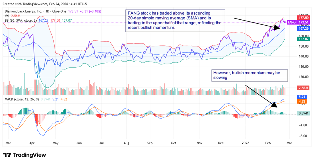 FANG stock has managed to stay above its ascending 20-day simple moving average (SMA). The Bollinger Bands are worth noting here. The upper band sits at $177.50 while the lower band is at $157.07, and the stock at $173.51 is trading in the upper half of that range, reflecting the recent bullish momentum.