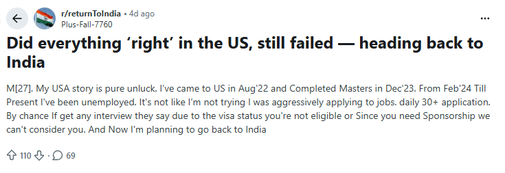 A 27-year-old Indian man said he planned to return to India after failing to secure employment in the United States despite completing a Master's degree and applying for jobs, according to a Reddit post titled “Did everything ‘right’ in the US, still failed, heading back to India”.
