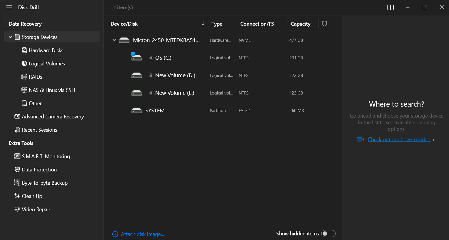 That said, the interface itself is pretty modern and sleek, with a pitch-black design. On the homepage, you will find a side panel that allows you to access all software features, including data recovery and extra tools.