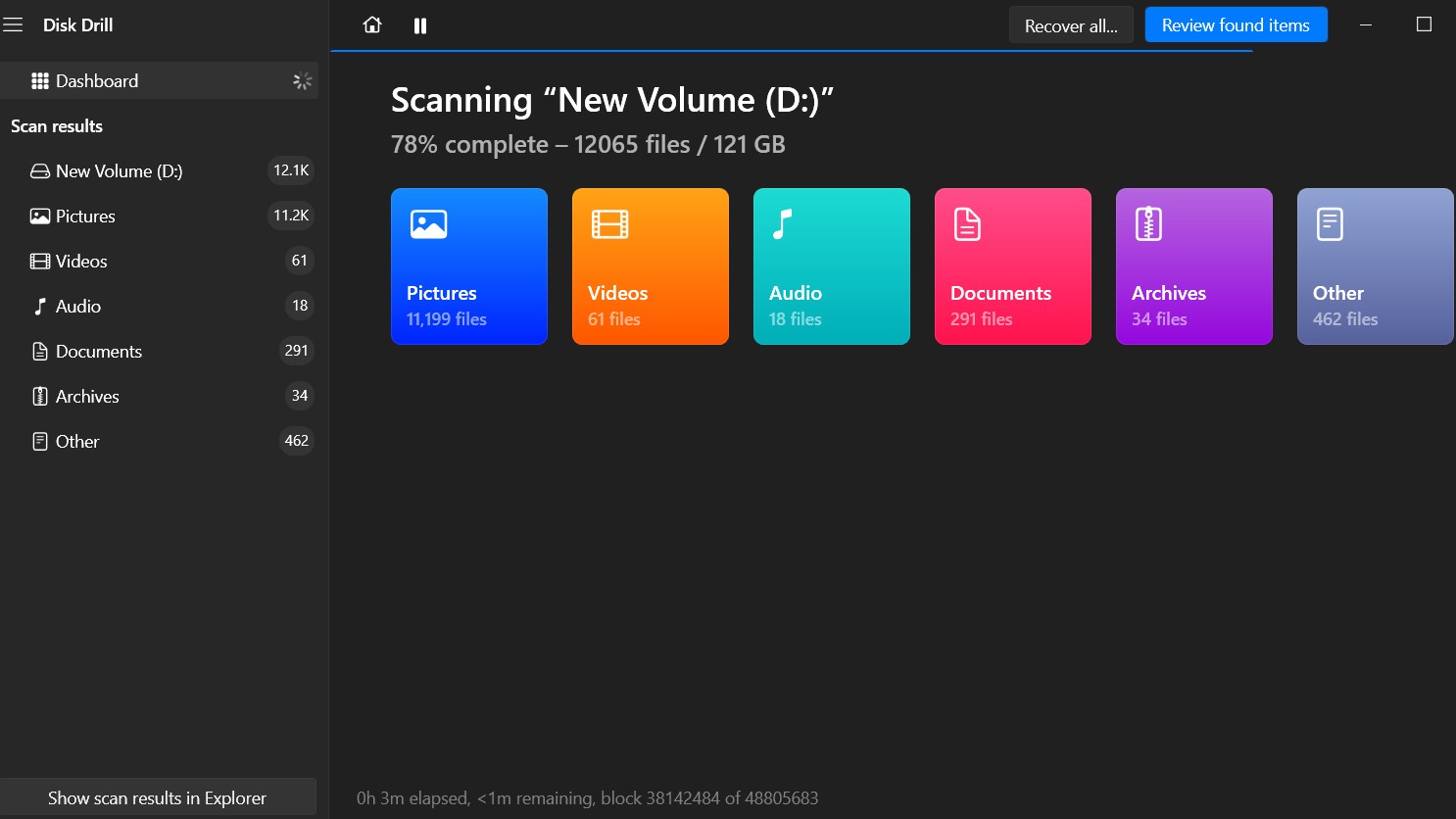 While the scan is in progress, you can review items that have already been found, including deleted files. This allows you to start the recovery process even before the entire scan finishes.