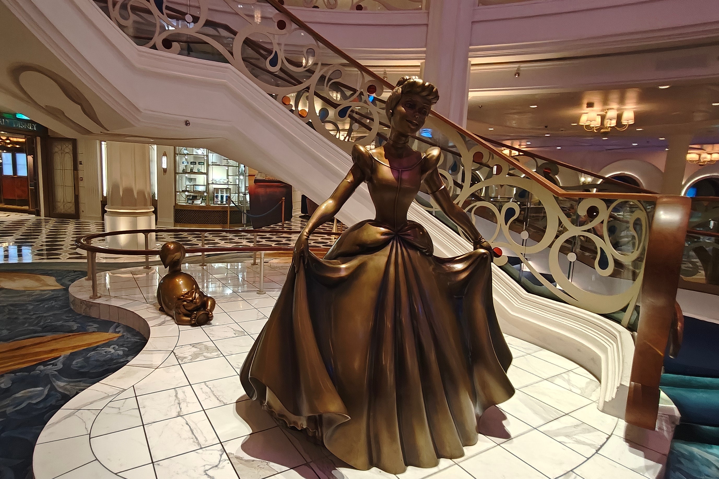 After passengers’ names are announced by the crew to a round of applause, guests are met with a bronze-sculpted Cinderella statue. A ballgown-shaped chandelier shines from the ceiling.