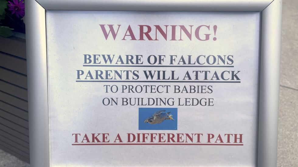 Peregrines used to nest on higher floors there. But the birds this year have nested low enough that they’ve become aggressive to humans walking below.