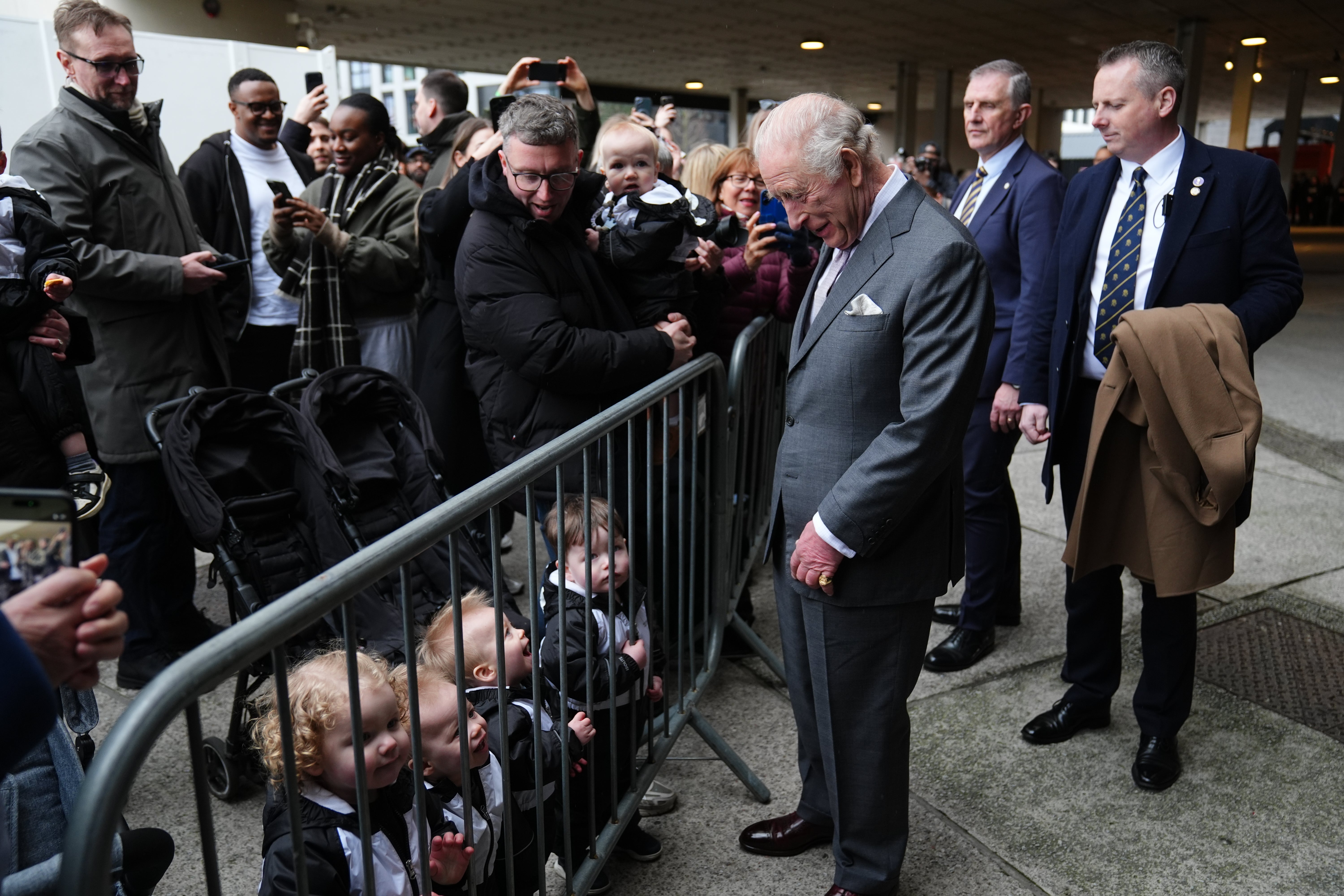 The King spoke briefly to members of the public who gathered outside the city-centre venue including child-minder Jodie Pownall, from New Mills, Derbyshire, who brought along one-year-old twins Teddy and Kuba, two-year-old Jackson, and Ronnie, Stevie and George, all aged one.