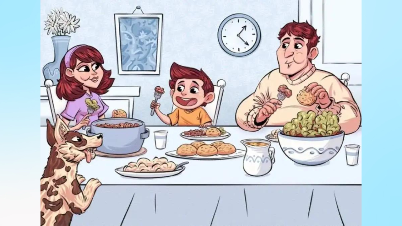 Only those with keen observation skills can uncover this mind-bending puzzle in less than 10 seconds. At first glance, it appears to be an ordinary family scene enjoying a meal with their beloved pet. Most people notice the eager dog anticipating its meal, but that's not the challenge here.