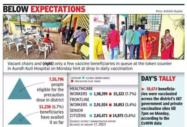 PUNE: Only 6% of the total beneficiaries for the precaution dose of Covid vaccines have availed it eight days into the drive in the district and the health officials attributed the low response to the miscued idea that the Omicron strain caused mild illness, besides many citizens not completing the requisite gap of nine months stipulated for availing the third shot.