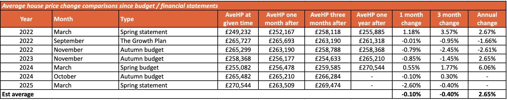 The company analysed the last seven major economic statements, comparing the rate of house price growth in the month immediately following each announcement, three months after, and a year later.