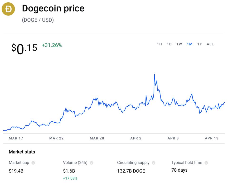The dogecoin price has lost 80% since memecoin madness pushed its price to 75 cents last year but it's rallied 30% over the last month, outperforming bitcoin, ethereum and other major cryptocurrencies. After buying just over 9% of Twitter earlier this month, Musk yesterday revealed he's offered to buy the company for $54.20 a share, valuing the firm at $43 billion.