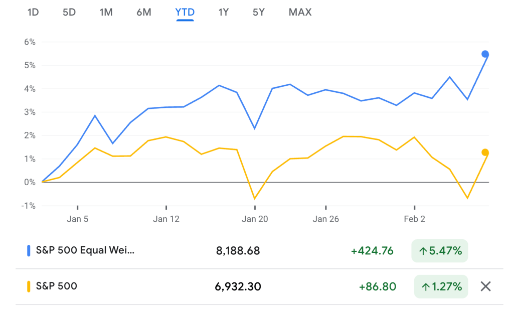 You can see that rotation in this chart, which compares the S&P 500 to a notional “equal-weight” index, which ignores each company’s market cap in order to treat all stocks equally. The real-world S&P is being held back by the decline of tech stocks, but all the other stocks in the index are doing quite well: