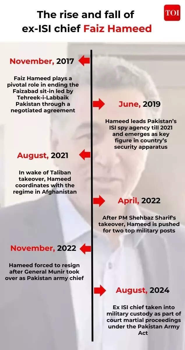 General Hameed was closely associated with Pakistan’s complex and often controversial relationship with the Taliban, especially during their takeover of Afghanistan in 2021. His presence in Kabul, shortly after the Taliban seized control, symbolized Pakistan’s ties to the group.His arrest may indicate a potential shift in Pakistan’s approach to dealing with militant groups like the Taliban.The Taliban takeover of Afghanistan was supposed to be a strategic masterstroke for Pakistan, especially for the army. But it seems to have backfired on Pakistan.There has been a steady rise in terror attacks in Pakistan since Taliban's takeover and TTP is supposed to be one of the key terror outfits behind it.Pakistan has accused Taliban of providing safe haven to TTP militants.Hameed's downfall may indicate a broader realignment within the military as it seeks to distance itself from past political entanglements. This shift could affect the military's influence over civilian governance and its relationships with political leaders, particularly as the country navigates ongoing political instability and economic challenges.