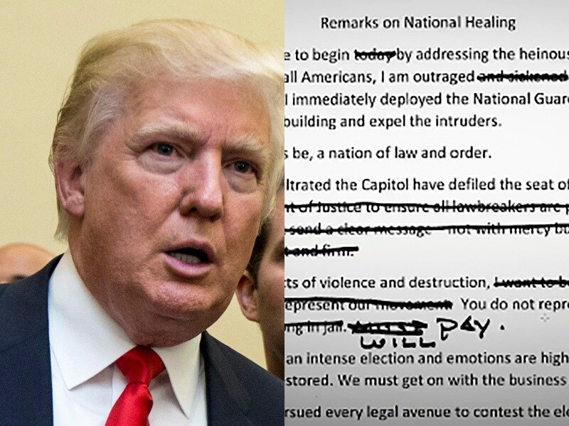 Donald Trump crossed out sentences that distanced him from the rioters who attacked the US Capitol on January 6, 2021.