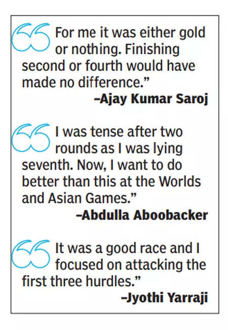 BANGKOK: It was double delight for India’s gold winning trio of Jyothi Yarraji, Ajay Kumar Saroj and Abdulla Aboobacker as they also booked their berths in the upcoming World Championships as area champions.
