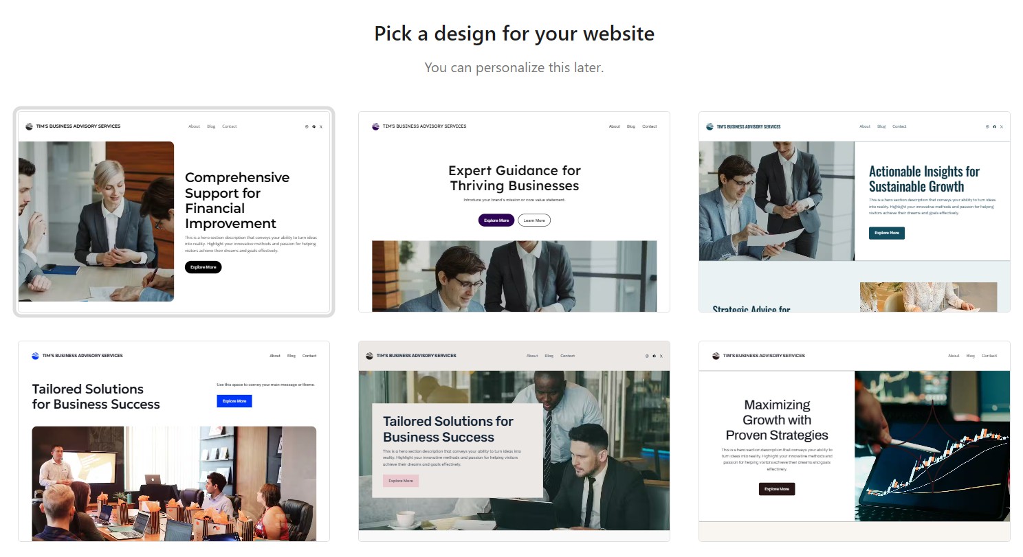 Their template library has a ton of very businessy-looking designs to choose from. Many of them scream "corporate," but I feel that changing a couple of images here and there will go a long way toward giving your website a unique look. After all, it's the overall structure that's essential.