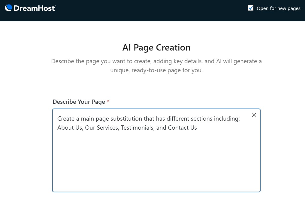 At this point, I noticed some minor but seemingly essential details. One that stood out was the AI Page Creation tool. This sounded promising, since it only required me to describe what I wanted, and DreamHost would build it for me.