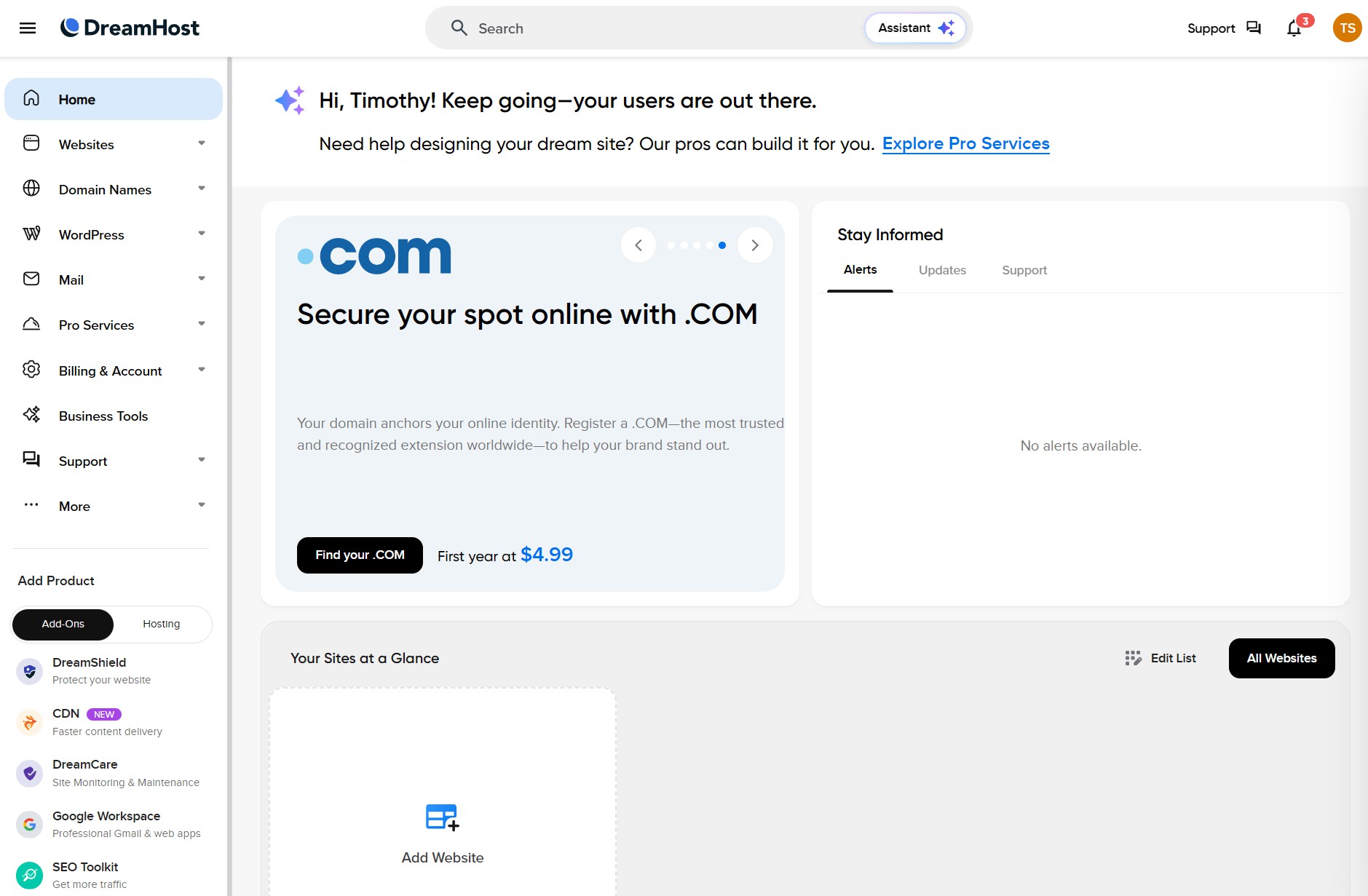 In less than two minutes, I'd cleared payment, received my "Welcome to DreamHost" emails, and gotten access to my client dashboard. This was to be my home base, from where I could choose from various options to manage my entire customer account - website, subscriptions, tools, and more.