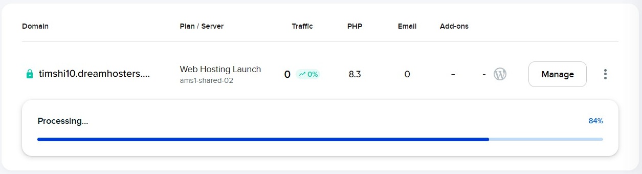 After a short bit of upselling for email and DreamShield Protection I'm directed to the main dashboard. No one likes upselling, and pushing security features at checkout is extra unlikeable in my opinion - hosting should come secure (and usually does) as standard.