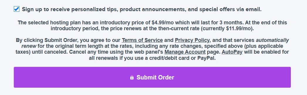 Once I confirmed my order, DreamHost tried to sneak in an option to add me to their marketing list. No thank you.
