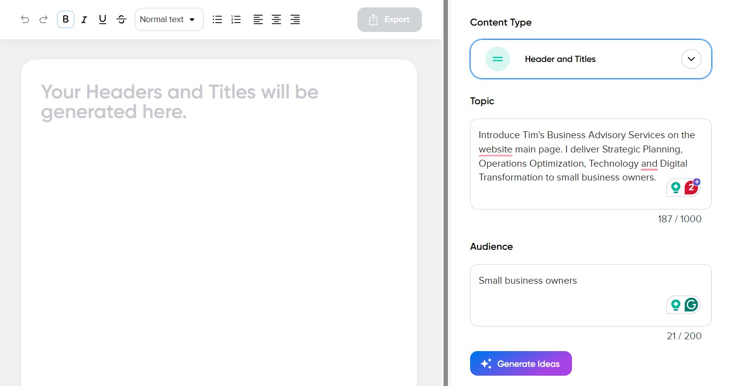 Part of the advisor is a content generation tool. I tried creating some content with it but after going through the motions I was stuck on the text blocks being generated.