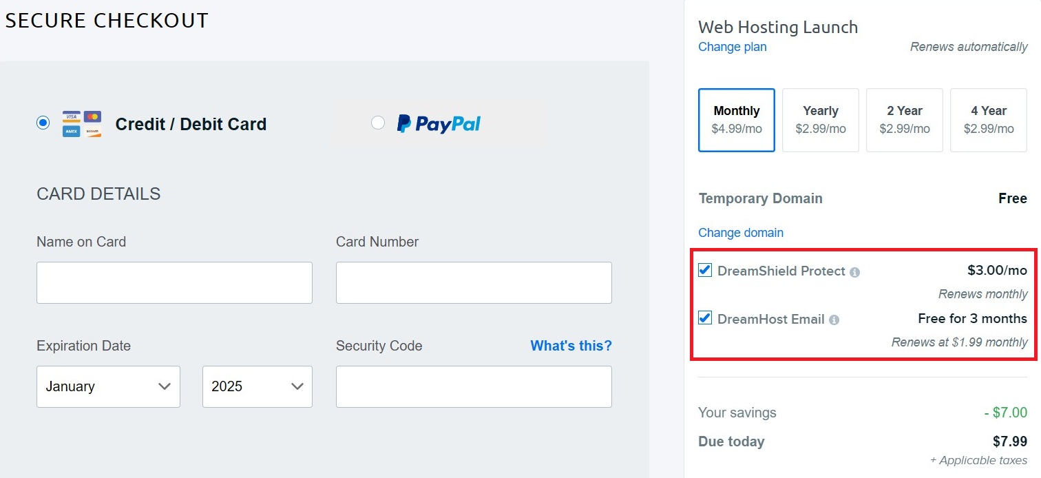 The first thing I noticed during the signup process was that DreamHost tried to tack on several upsells. There's nothing wrong with this, and many others do the same. However, I dislike having the options pre-selected for me by default.