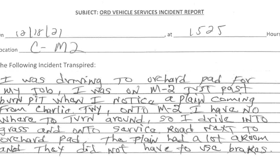 He told his bosses in a written statement that, “I was on M-2 just past burn pit when I notice a [plane] coming from Charlie Taxiway, onto M-2. I have nowhere to turn around, so I drive into grass and onto service road next to Orchard Pad. The [plane] had a lot of room and they did not have to use brakes.”