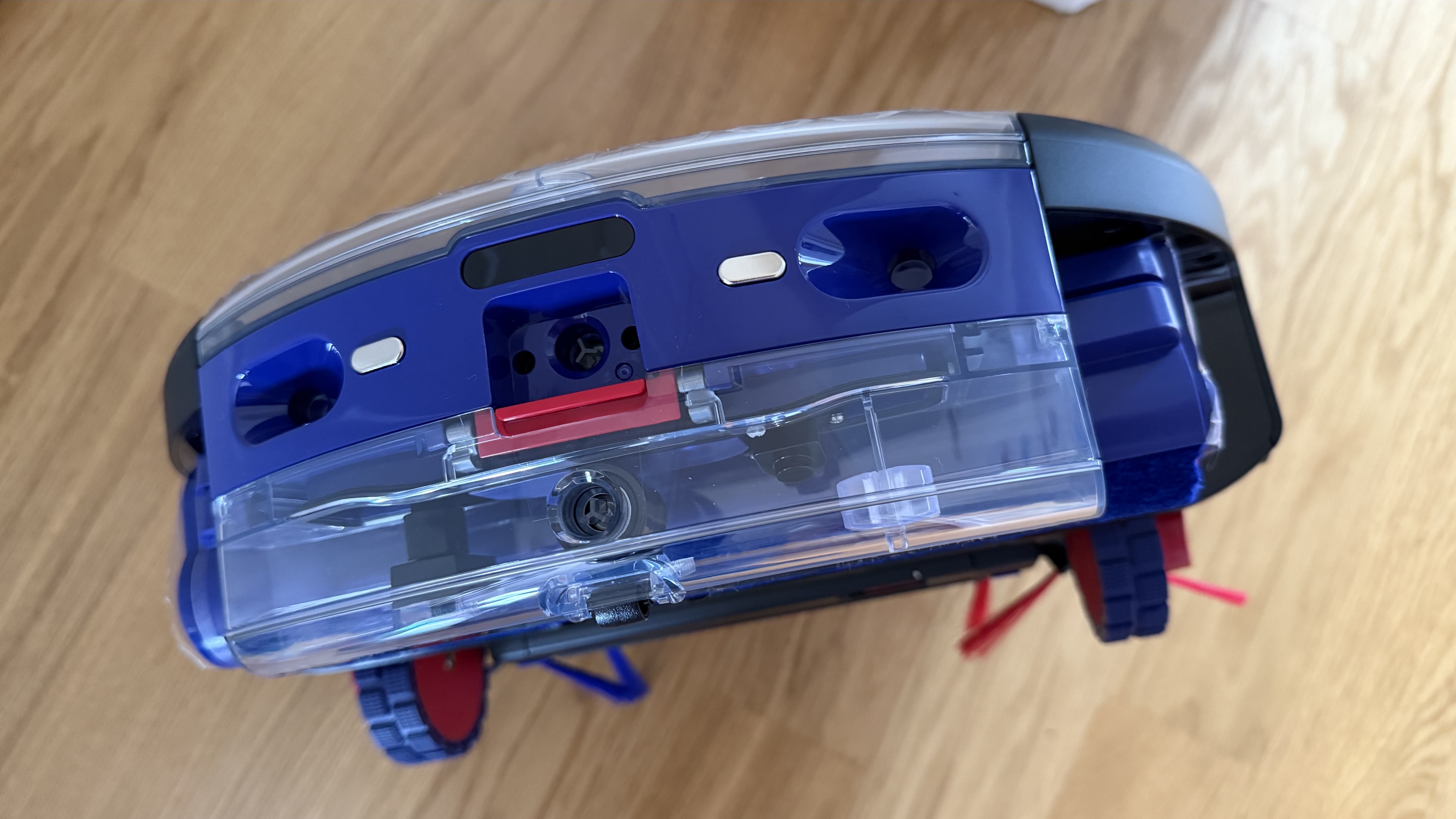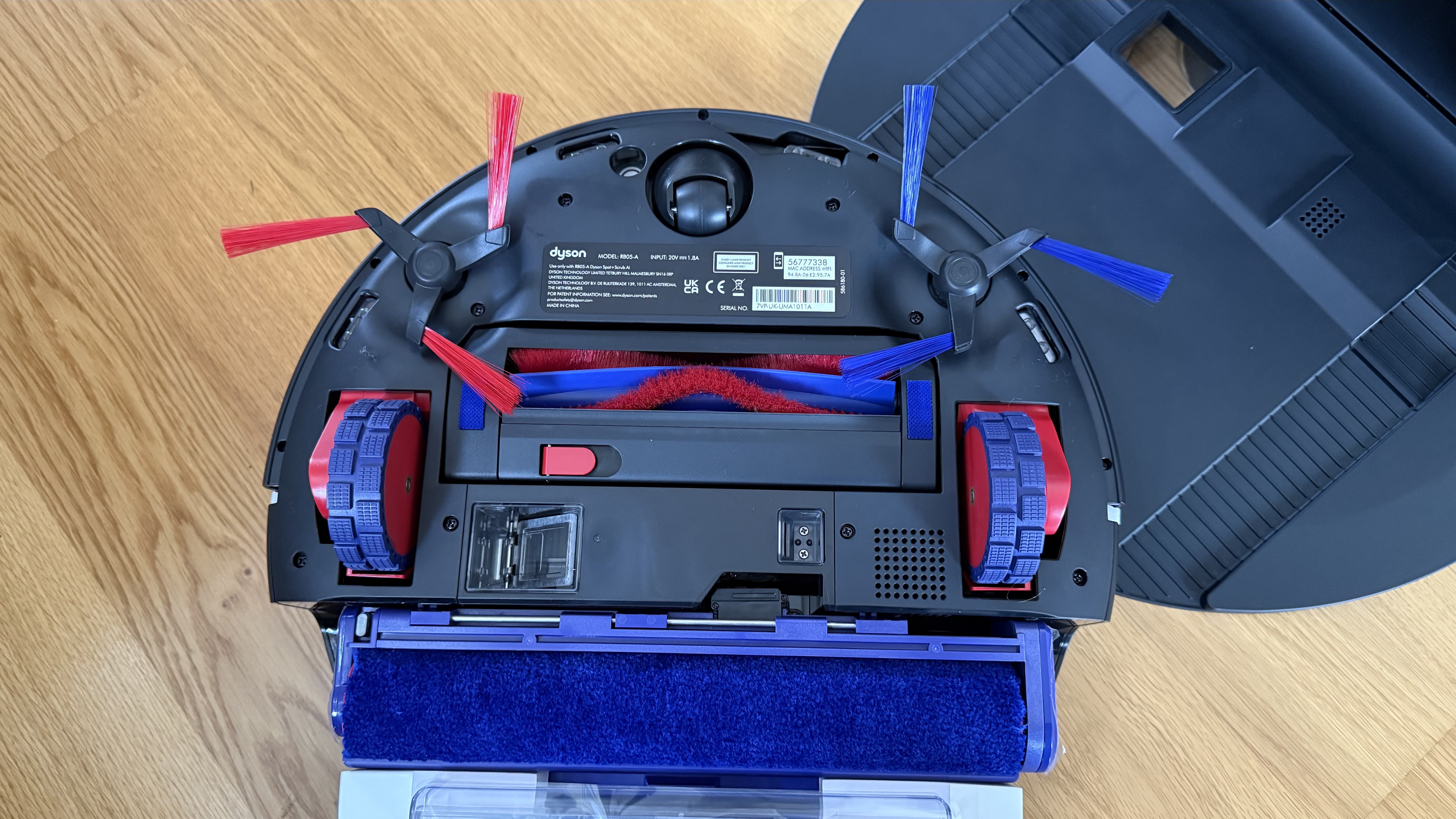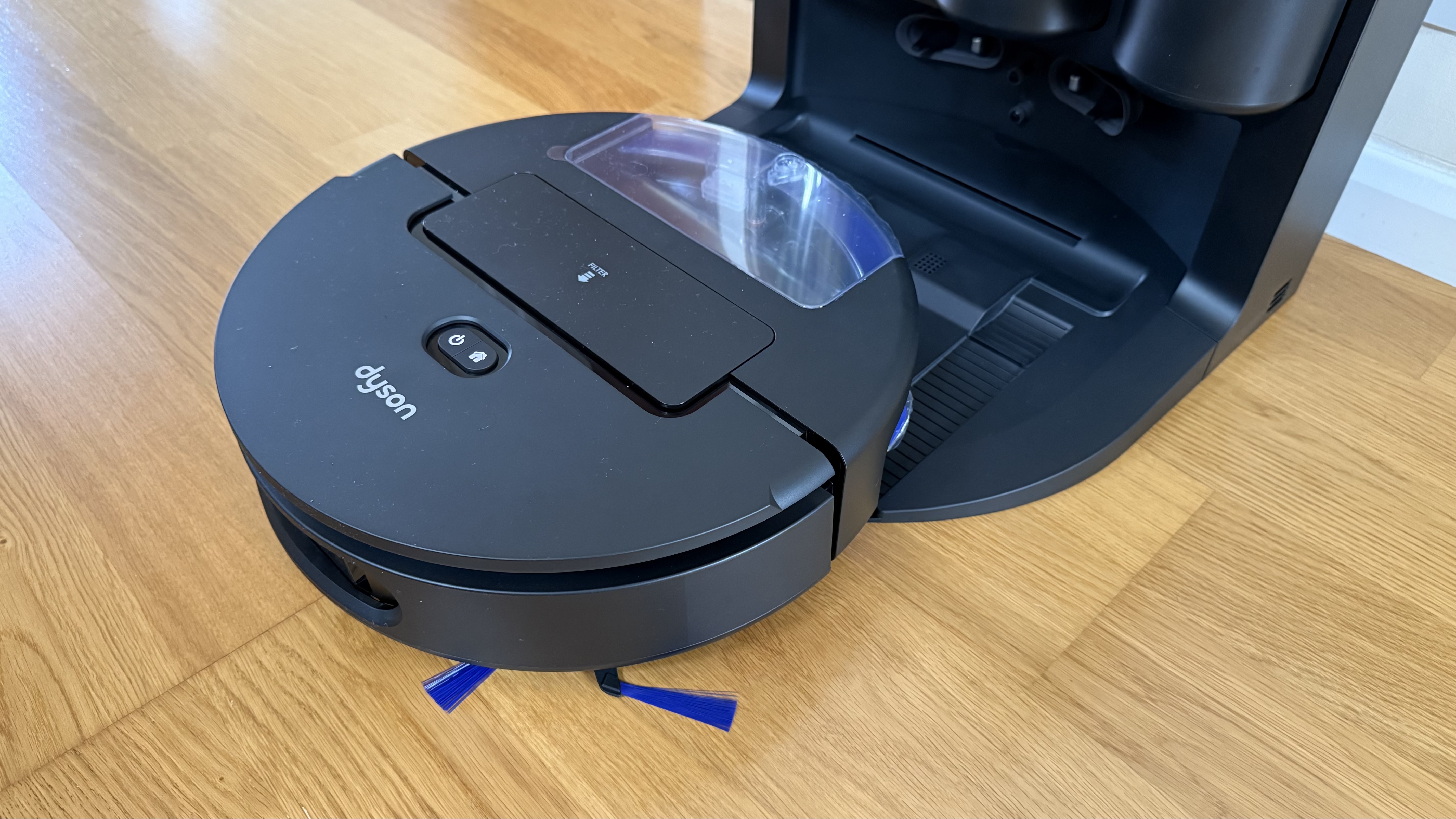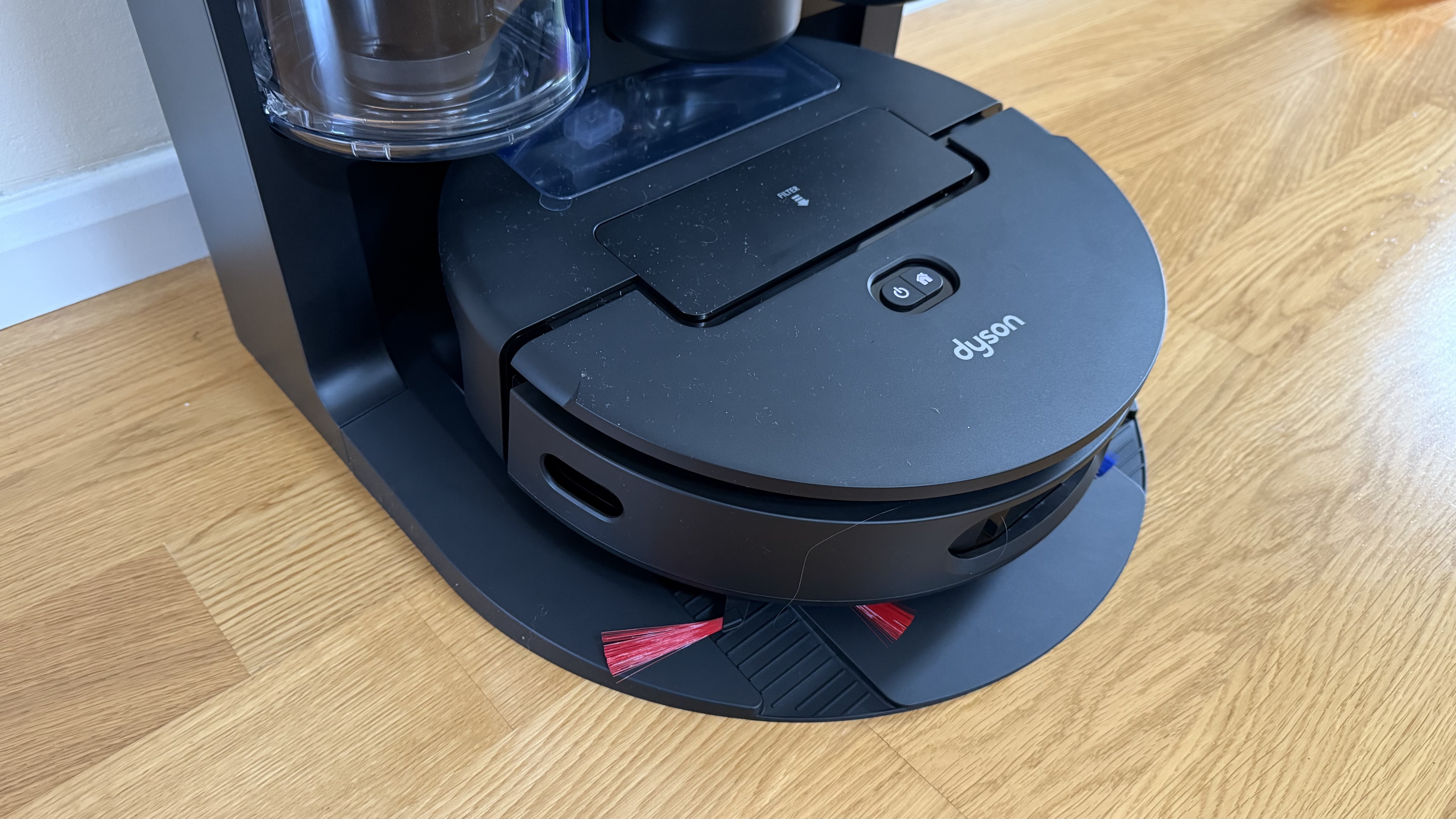 Of course, this being a Dyson, there are some purple and red flourishes that remind you it’s a Dyson, most notably on the bin container and also on the underside of the robot vacuum. Not that this part is exactly visible unless you pick it up. This is also where the roller mop is situated, which in turn is kept operational by using the clean and dirty water tanks back on the base station to keep it going. Warm water cleaning is a positive here too, although this is a common feature on many of the latest robot vacuums.
