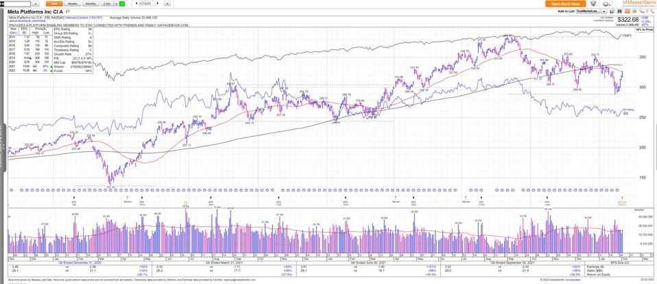 Meta Platforms Inc. (formerly Facebook), is scheduled to report earnings after today’s close. Facebook hit a record high of $384.33/share in 2021 and is currently trading near $322/share. The stock is prone to big moves after reporting earnings and can easily gap up if the numbers are strong. Conversely, if the numbers disappoint, the stock can easily gap down. To help you prepare, here is what the Street is expecting: