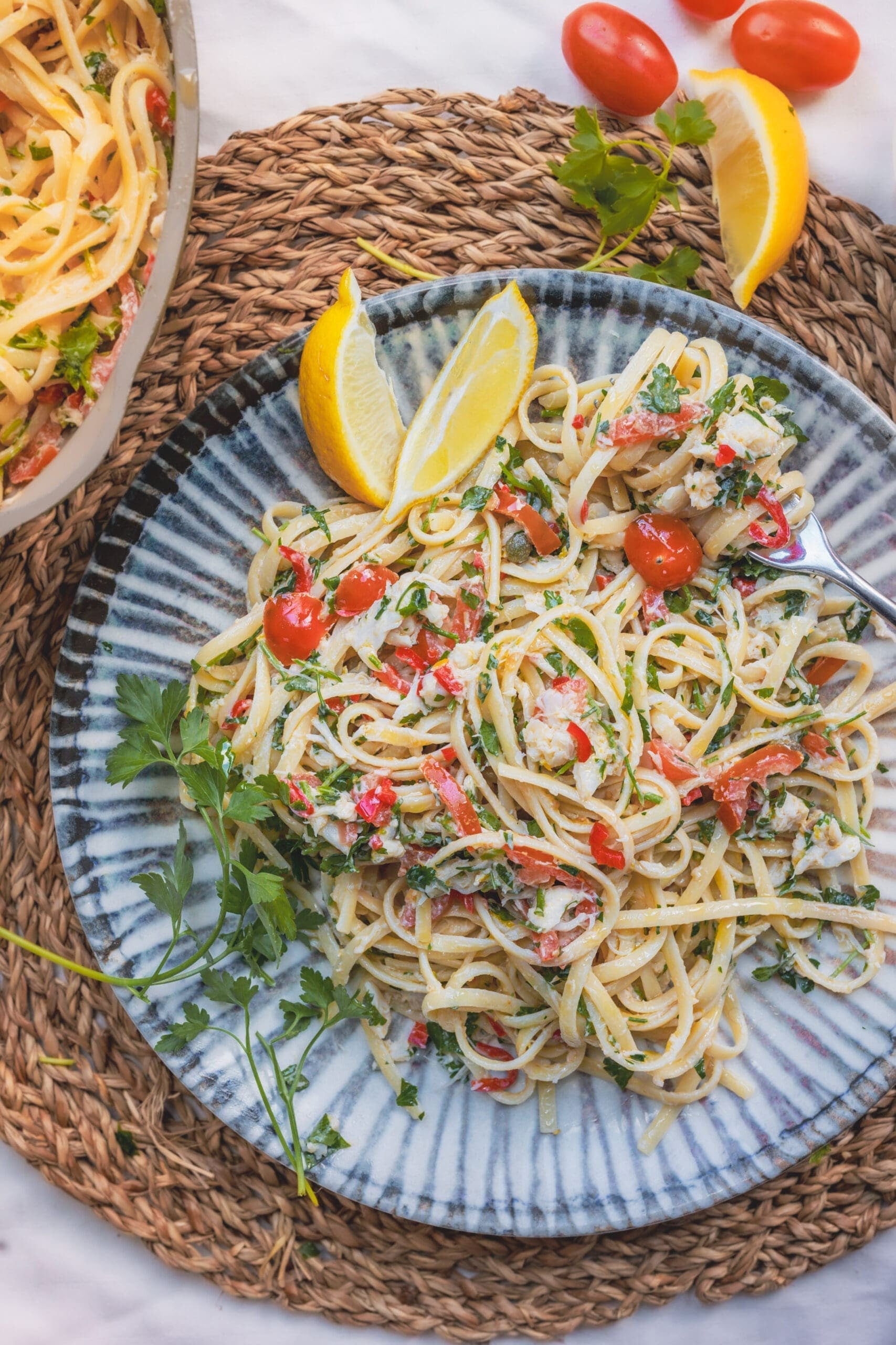 3. When the pasta is cooked al dente, add it to the creamy sauce, along with a little of the starchy water, reserving an extra cup in case the sauce needs loosening further. Gently stir through the crab meat and parsley and put a lid on for a couple of minutes for the linguini to absorb the flavours. If needed, add a little extra cooking water before serving.
