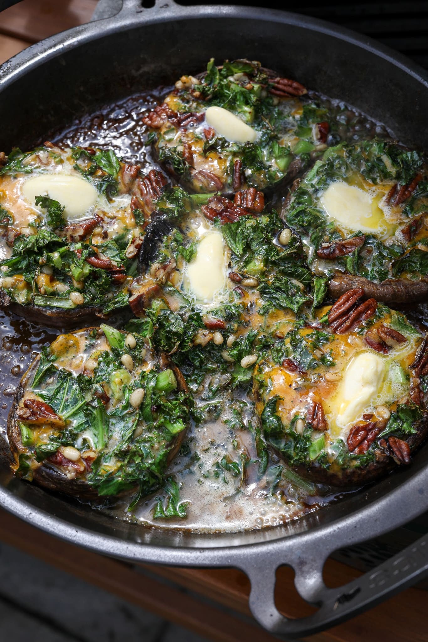 2. Spoon the mixture generously into each mushroom cap. Place the mushrooms in a BBQ safe tray or cast-iron pan. Add a knob of butter to the pan, letting it melt and bubble into a rich, sticky sauce.
