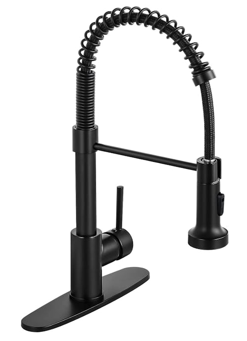 For a contemporary upgrade, install this pull-down faucet in your kitchen. It comes with a deck plate so it can be used for a one or three-hole sink, and the 360-degree rotation offers a wide range of motion that’s enhanced with a high-arc spout design. The faucet has a switch to go between spray and stream settings and the brushed finish repels fingerprints and watermarks for effortless maintenance.