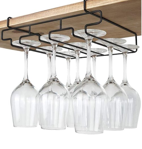A wine glass holder for stylish storage that frees up cabinet space