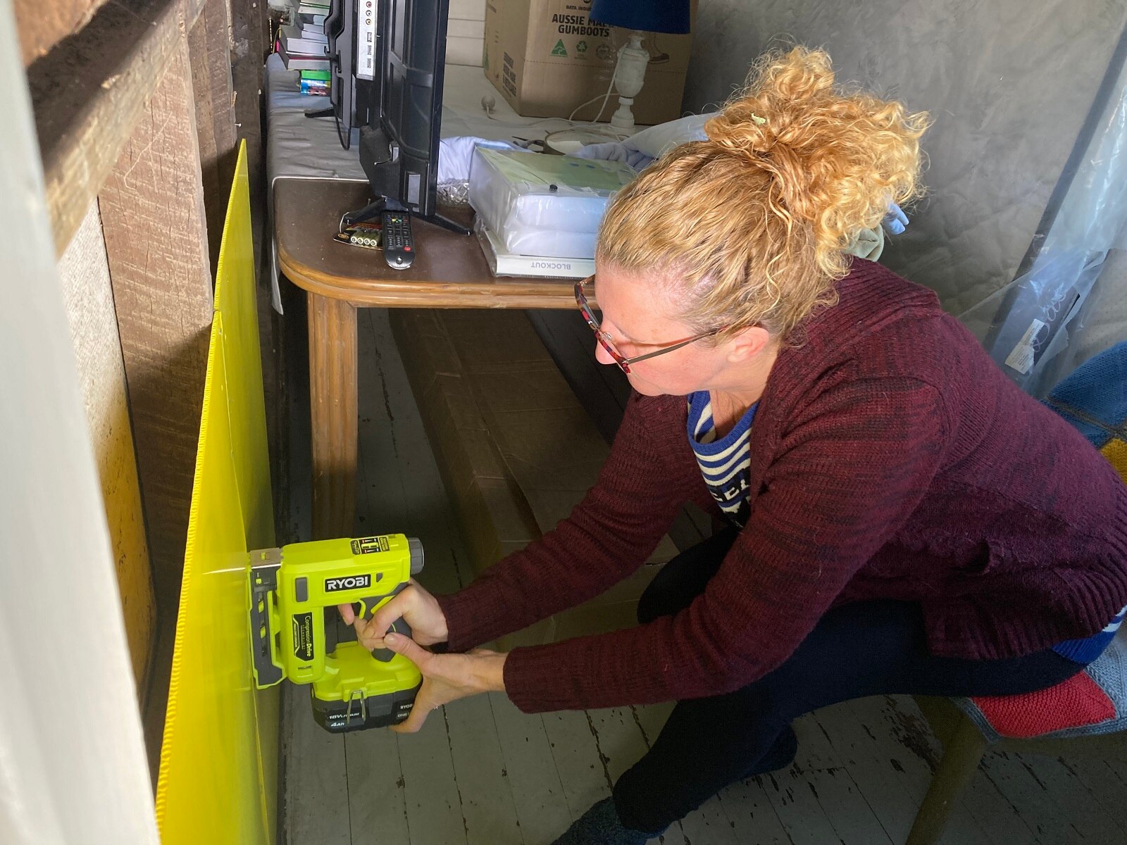 "What I've done with some packing tape and a staple gun is go around where all the walls have been removed and try to just cover them up a bit to keep some of the warmth in, and on the other side of the room we've used old removalist blankets to do the same.