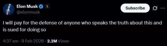 The tech billionaire made this commitment on X, replying to conservative commentator Matt Walsh's posts about the PSA. "I will pay for the defense of anyone who speaks the truth about this and is sued for doing so," said Musk.