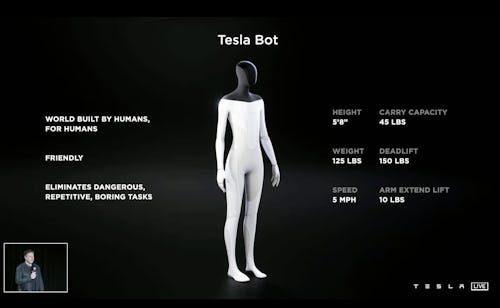 As of now, Optimus (also known as the Tesla Bot) is little more than a moonshot. Musk’s initial presentation of the bot — in which a person in a white bodysuit danced on-stage, for some reason — revealed almost nothing about the bipedal AI machine. He claimed at the time that Tesla would be ready to show off a working prototype at some point in 2022.