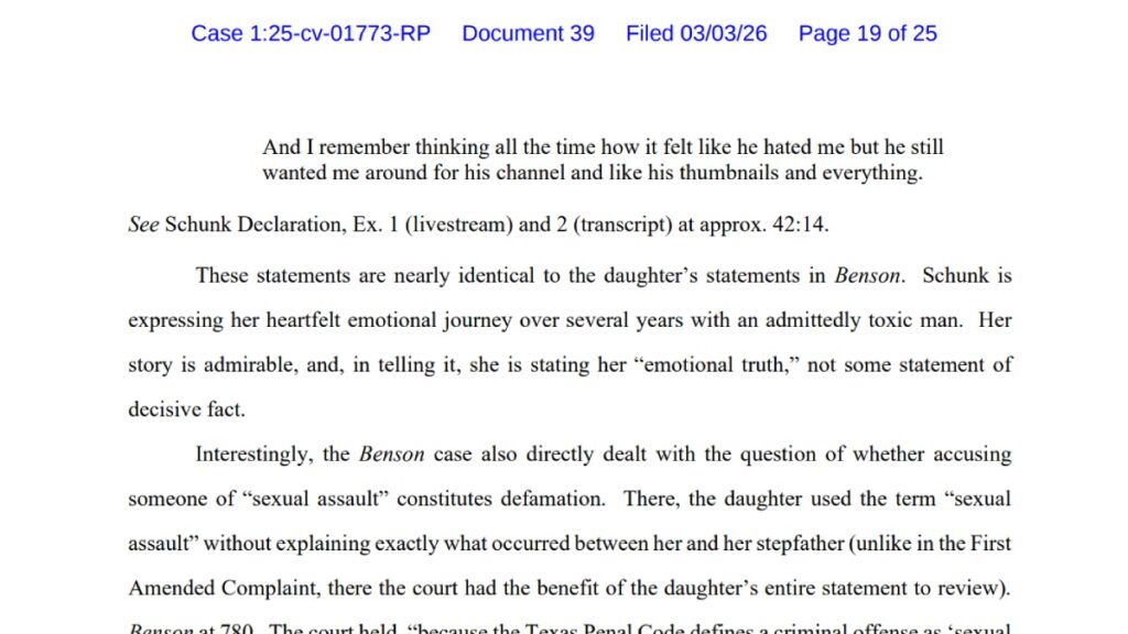 The brief cites Texas case law holding that context matters: even a statement that could be fact‑checked can be treated as opinion when made in a clearly subjective, narrative setting. To drive the point home, Emiru’s team points to a Texas Court of Appeals decision where a daughter’s TikTok labeling her stepfather a sexual abuser was treated as an emotionally charged personal account in context, not defamation, despite the gravity of the accusation.