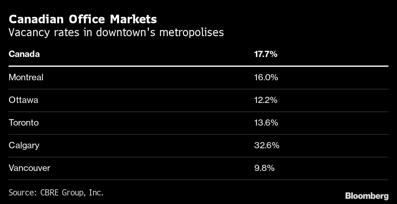 Montreal’s office-vacancy rate has doubled from 2019, with more than 7.4 million square feet (687,000 square meters) of rentable space available — the equivalent of two of Manhattan’s One World Trade Center towers.
