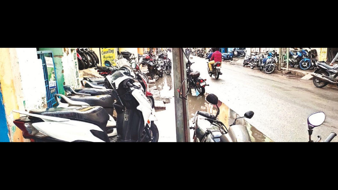 Since pedestrian platforms are exploited by used bike showrooms to display their vehicles, people are forced to walk on the carriageway. The two-foot-wide pedestrian slabs are occupied by around 20 showrooms. Though the road is only 25-foot-wide, visitors park their vehicles well over the carriageway.