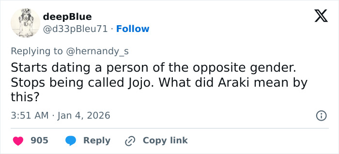 The user’s comment referenced the popular Japanese manga/anime JoJo’s Bizarre Adventure, since the singer shares her stage nickname “JoJo” with the protagonists of the Hirohiko Araki-created series.