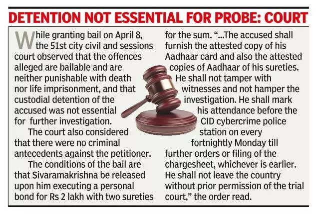 In his bail petition, Sivaramakrishna rubbished the allegations against him and contended that he was falsely implicated in the case by police on the instigation of his ill-wishers. He claimed he had been framed to prevent him from attending an interview for the post of senior technical officer grade-I at National Aerospace Laboratories (NAL).