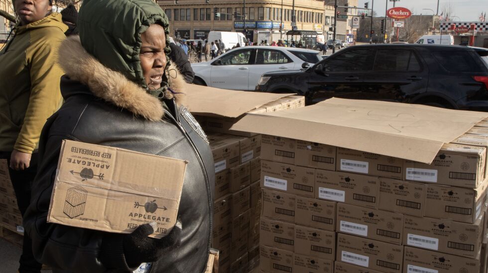 Charlotte Woods braved cold weather for over an hour Monday morning at an Englewood lot for a chance to receive a free box of frozen meat.
