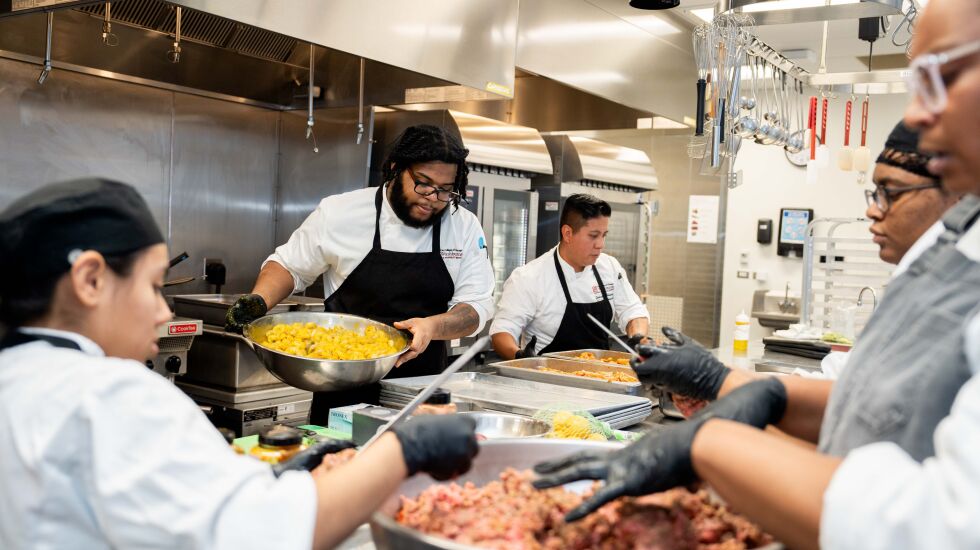 As he added seasonings to a bowl of shrimp for lunch service, Christopher Benford, 20, said one of his biggest takeaways from his two years at Washburne was gaining confidence as a chef.
