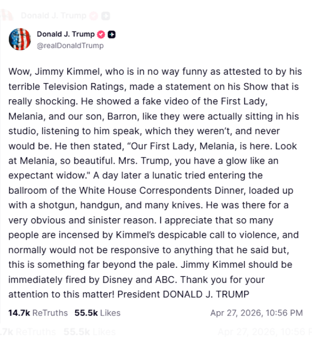 Donald Trump later weighed in, calling for ABC to fire the comedian. In a Truth Social post, he said, “I appreciate that so many people are incensed by Kimmel’s despicable call to violence, and normally would not be responsive to anything that he said but, this is something far beyond the pale. Jimmy Kimmel should be immediately fired by Disney and ABC.”