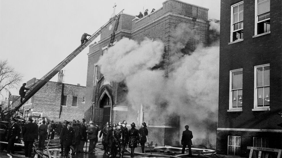 At the time of the fire, we’re told, Chicago had a population of 3 million, with some 2 million Roman Catholics and a total of 262 parishes. (To this day, many Chicagoans will identify where they grew up by naming their parish.) Our Lady of the Angels in Humboldt Park had a total of some 1,500 students packed into classrooms in a structure with wood interiors. There were no sprinkler systems, and there was a second-floor stairwell that lacked a fire door; safety codes of the time did not apply to schools that were built before 1949 — schools such as Our Lady of the Angels.