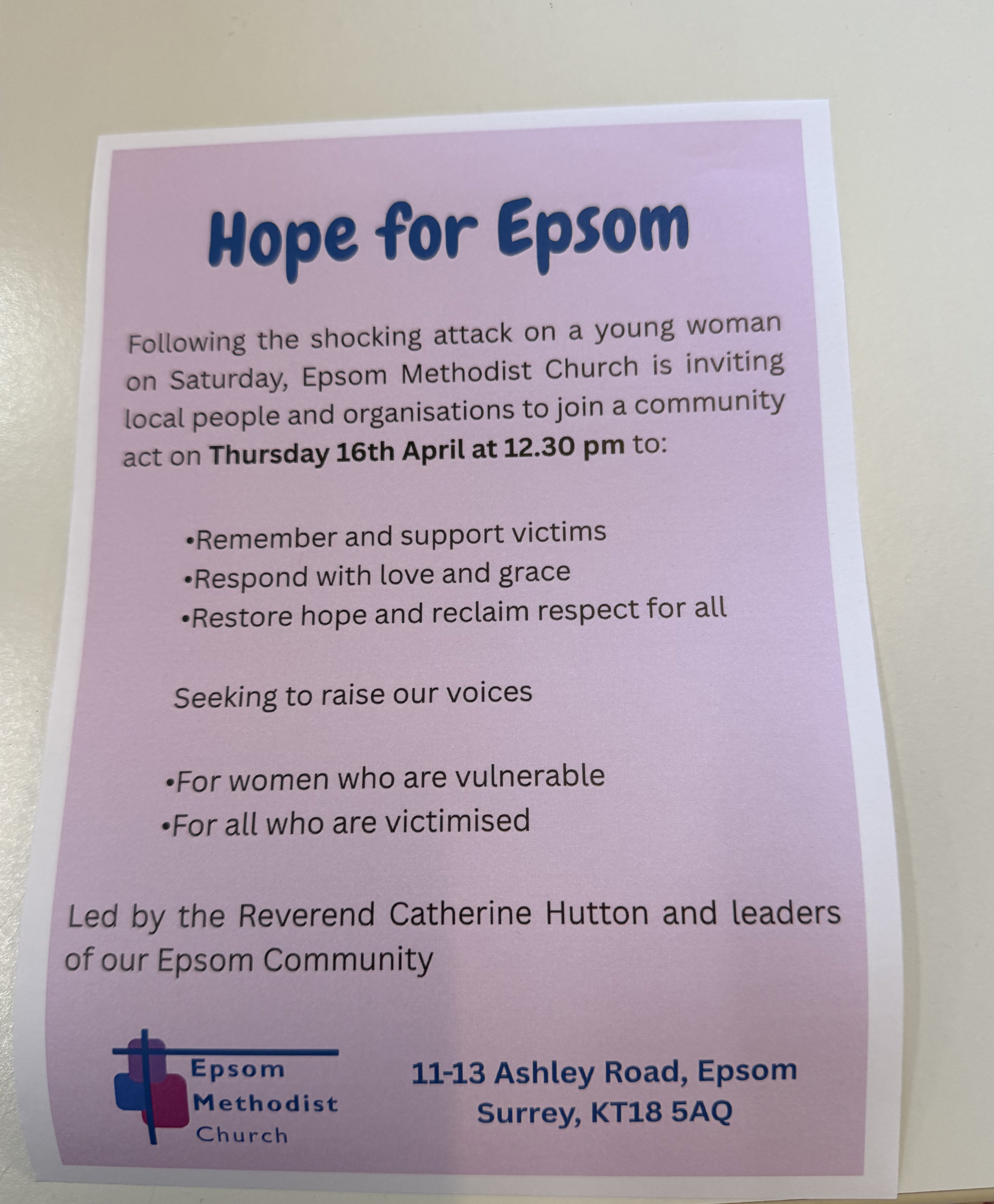 Nothing of “this scale of horror” has happened in the Surrey town before, Reverend Catherine Hutton of Epsom Methodist Church said after a woman reported she had been attacked.