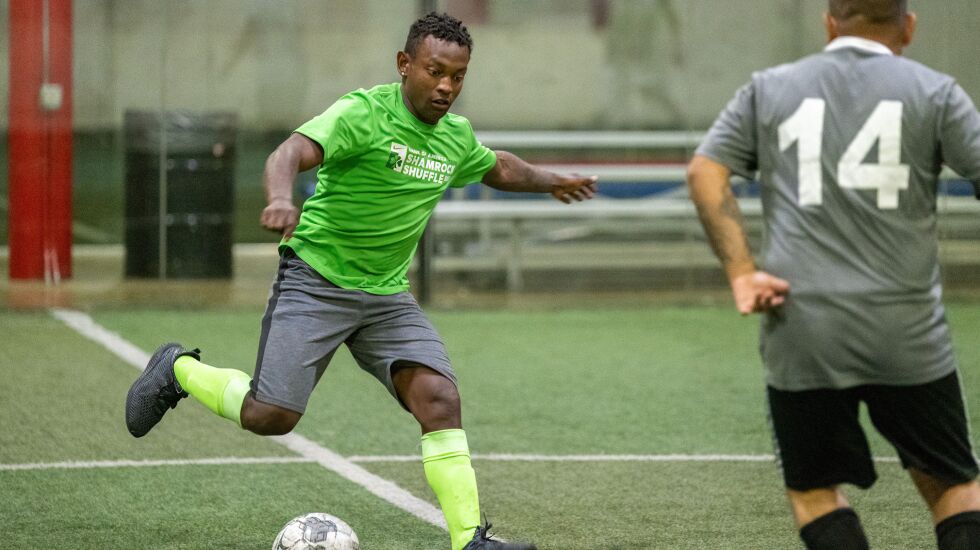 En una noche reciente entre semana en una cancha de fútbol del lado sur de Chicago, los dos hombres y sus compañeros de equipo, quienes salieron de Latinoamérica y llegaron a los EE.UU. recientemente en busca de asilo, se mostraban livianos a pesar del viaje.