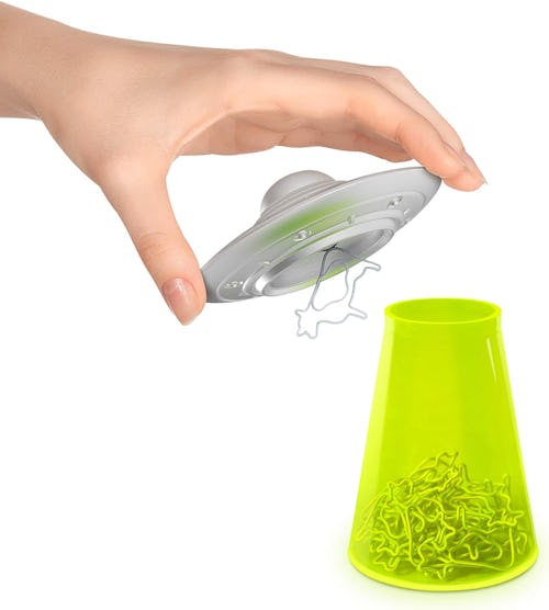 Don’t let your paper clips get lost; this flying saucer holder will keep them corralled in the neon acrylic base. When you need one, utilize the magnetic UFO lid to grab it. The set comes with 20 white cow-shaped paper clips.