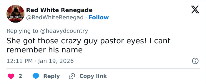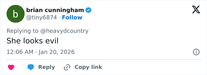 “Erika is too pretty to wear all that makeup! I don’t understand why she covers her true beauty with gobs of makeup?! It makes her look like Tammy Faye,” added a third, referencing the eccentric evangelist.