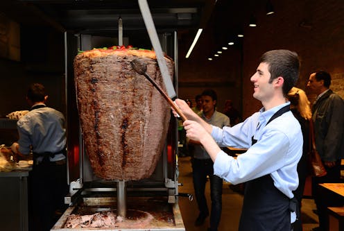 In Greece, it became known as gyros, also meaning “turn”. In an interesting case of reverse linguistic borrowing, the equivalent in the Arabic-speaking world is now called shawarma, an Arabised form of the Turkish çevirme, also meaning “turn(ing)”.