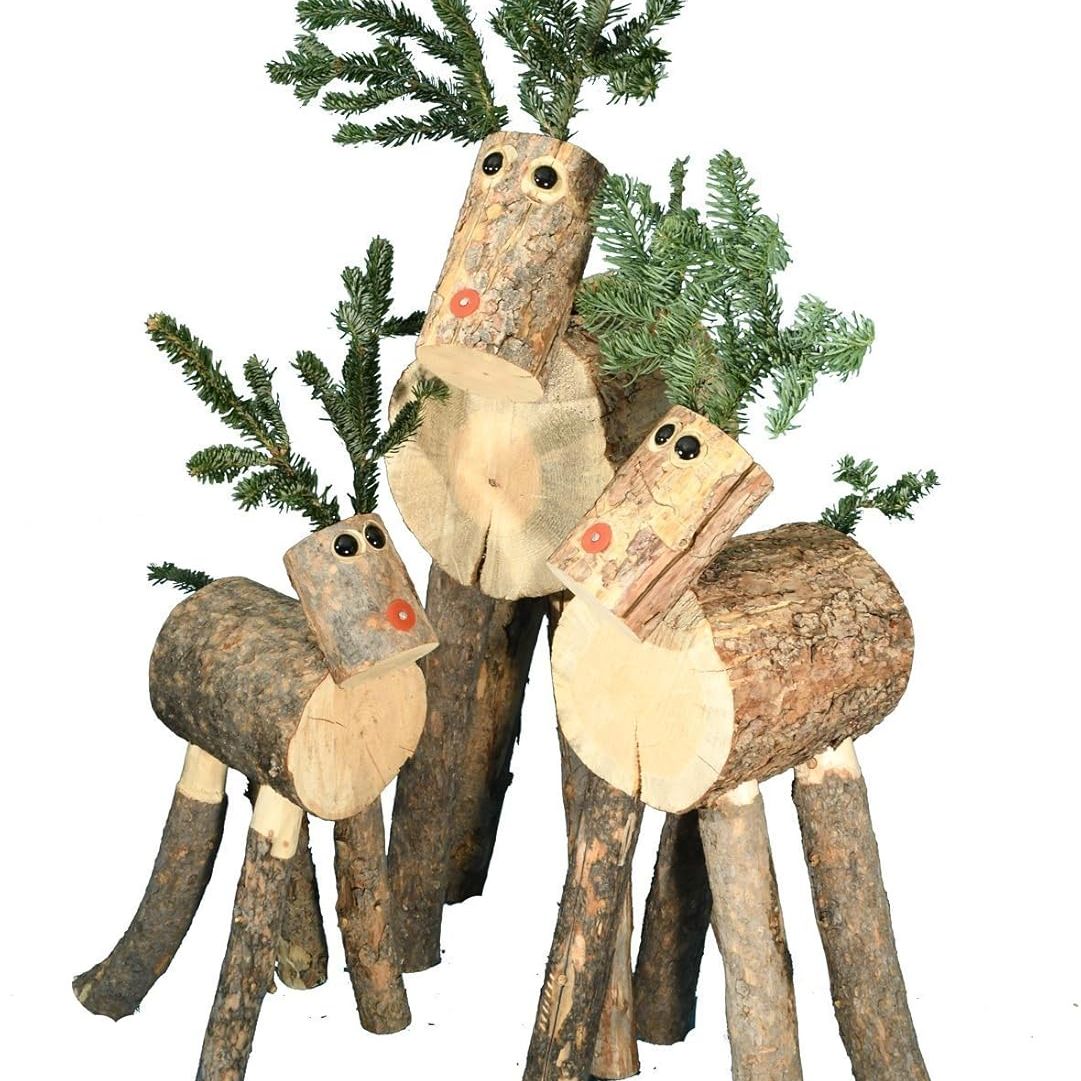 Aniston's Rudolph is constructed from small wooden logs that make up the animal's body and face; the two antlers are made up of Christmas tree branches; and a small crimson tree ornament is used for the iconic red nose.