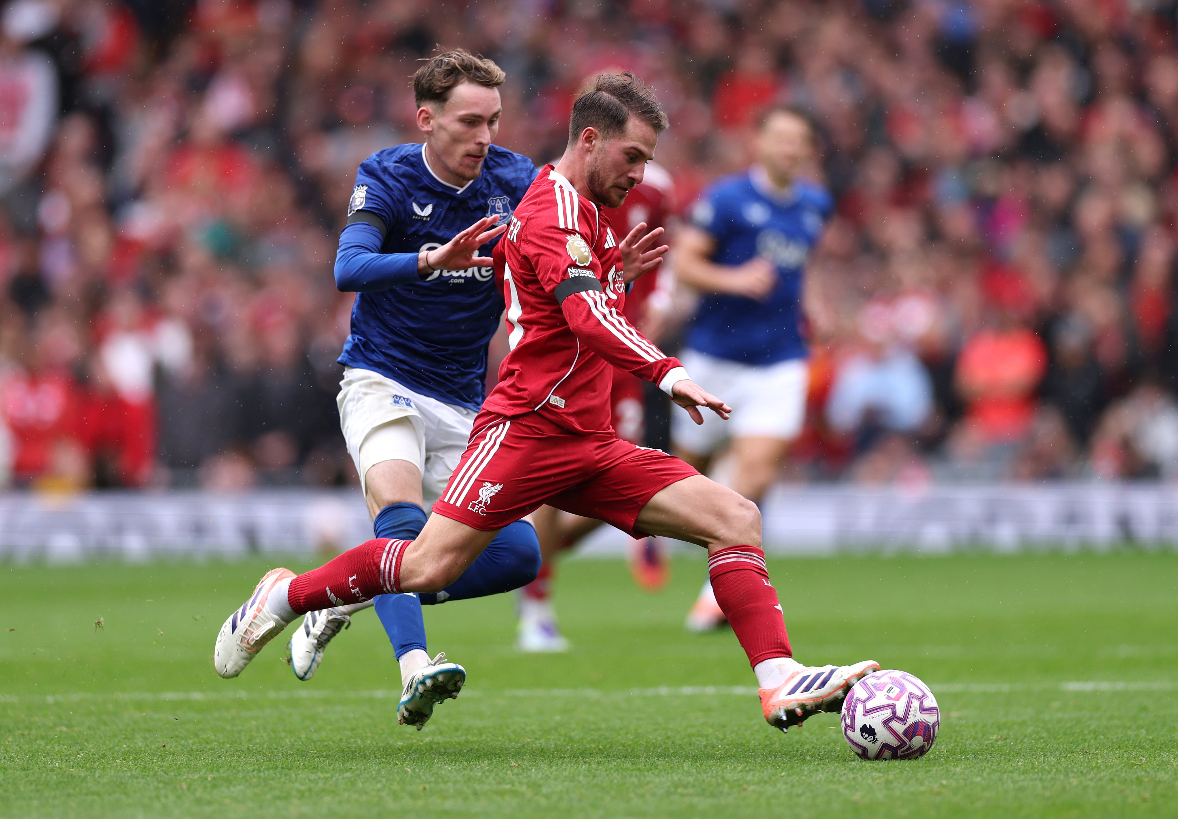 Giorgi Mamardashvili first made an important stop to deny Beto’s header before Everton twice got in behind the Liverpool defence. Kiernan Dewsbury-Hall was played in with a ball over the top and demanded a penalty after stand-in right back Curtis Jones came in from the side and challenged him with his shoulder. Beto was slipped through but was closer to the corner flag than the goal with his finish as he opened up his body and looked for the far corner.