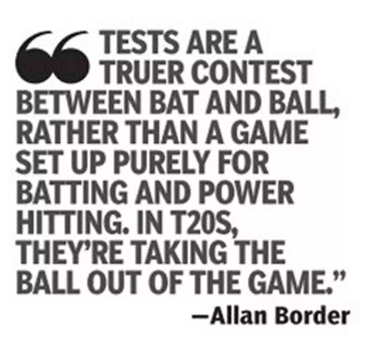 The contest between bat and ball is better in Tests. In T20s, they're trying to take the ball out of the game. They want to see aggressive batting. The bowler is secondary. In Tests, the bowling has a big say. I'm a real fan of Tests for that reason. It's a better contest between bat and ball, a truer contest rather than a game set up purely for batting and power hitting. Just look at Bumrah. His presence has lit up this series. I like T20 for what it brings, but it's a different crowd. I don't think it has hurt Test cricket.